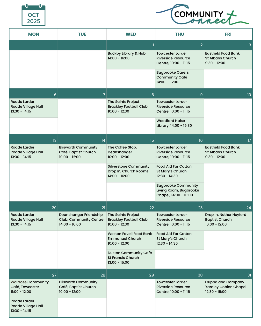 - Towcester Larder, Riverside Resource Centre 10.00 – 11.15