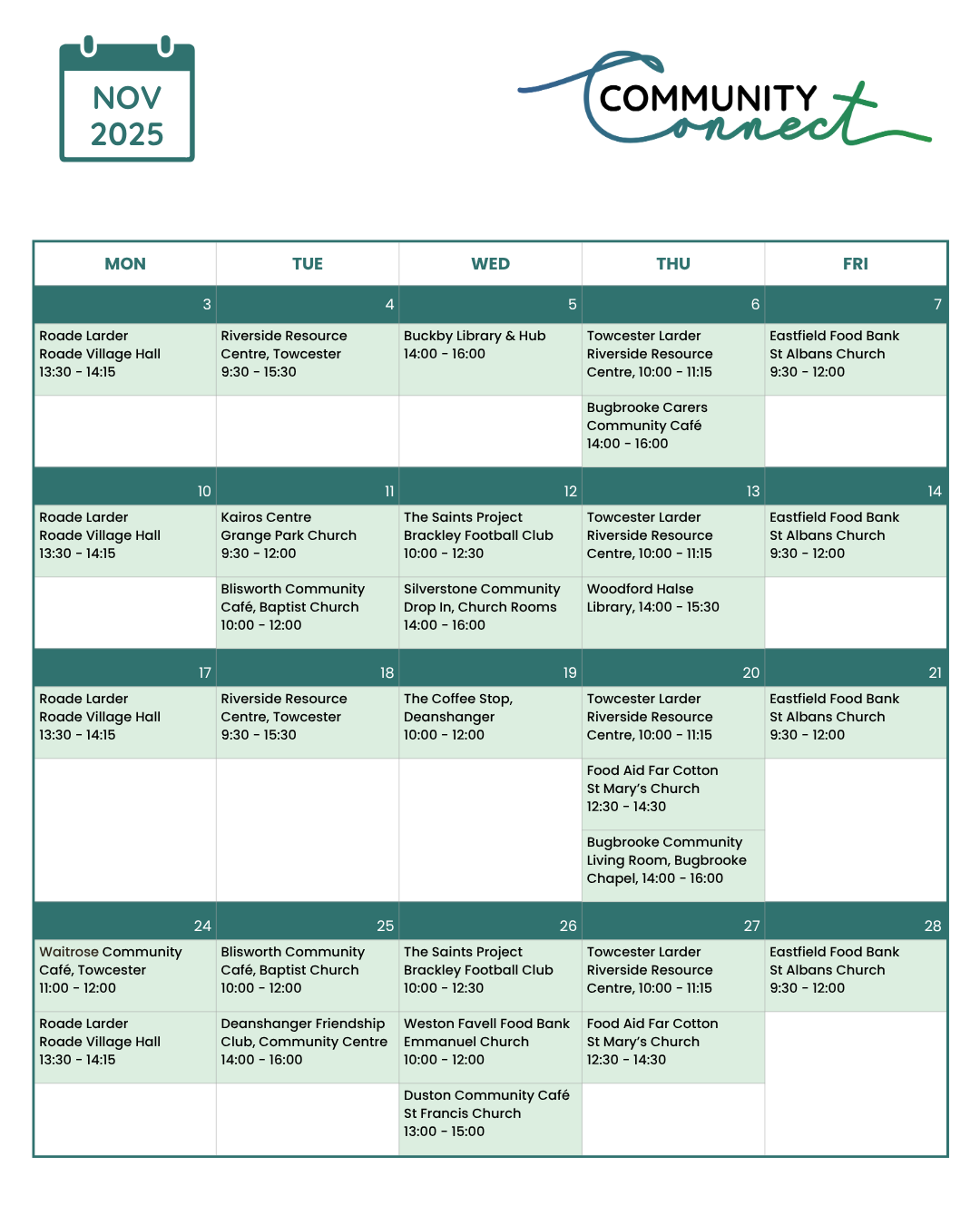 - Weston Favell Food Bank, Emmanuel Church 10.00 – 12.00