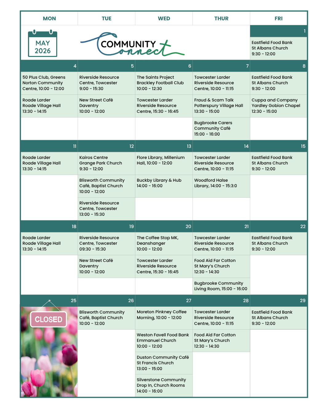 - Eastfield Foodbank, St Albans Church 9.30 – 12.00